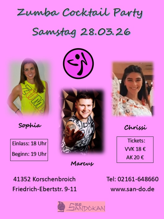Zumba Cocltail Party Mit Chrissi, Sophia und Marcus 28.03.2026 18:00 Uhr Dojo: Hauptzentrum Honbu Dojo Friedrich-Ebertsrtaße 9-11 41352 Korschenbroich Einlass: 18 Uhr Beginn: 19 Uhr Info: 02161 64 86 60 Tickets:Vorverkauf: 18 EURAbenkasse: 20 EUR Anhänge: flyer Download (94,715 KiB)